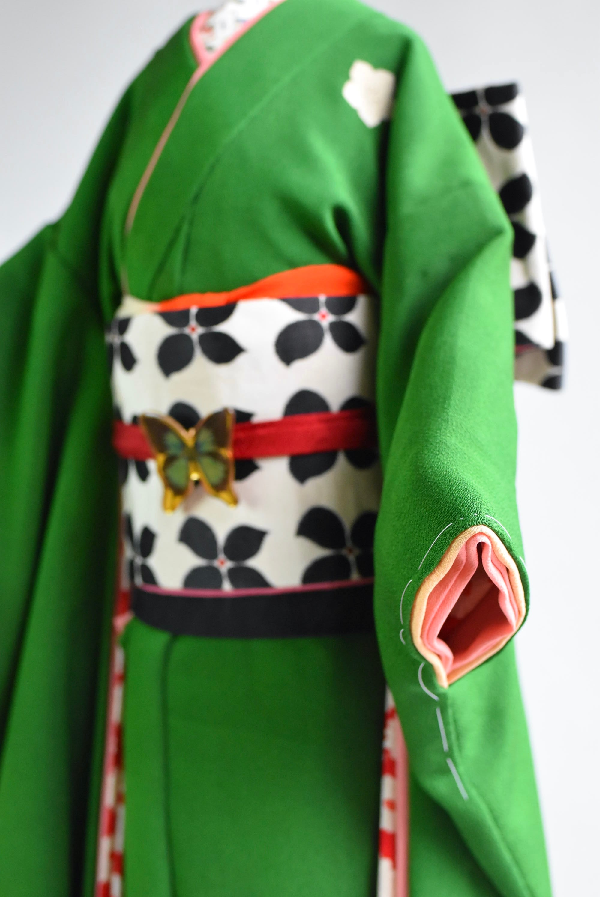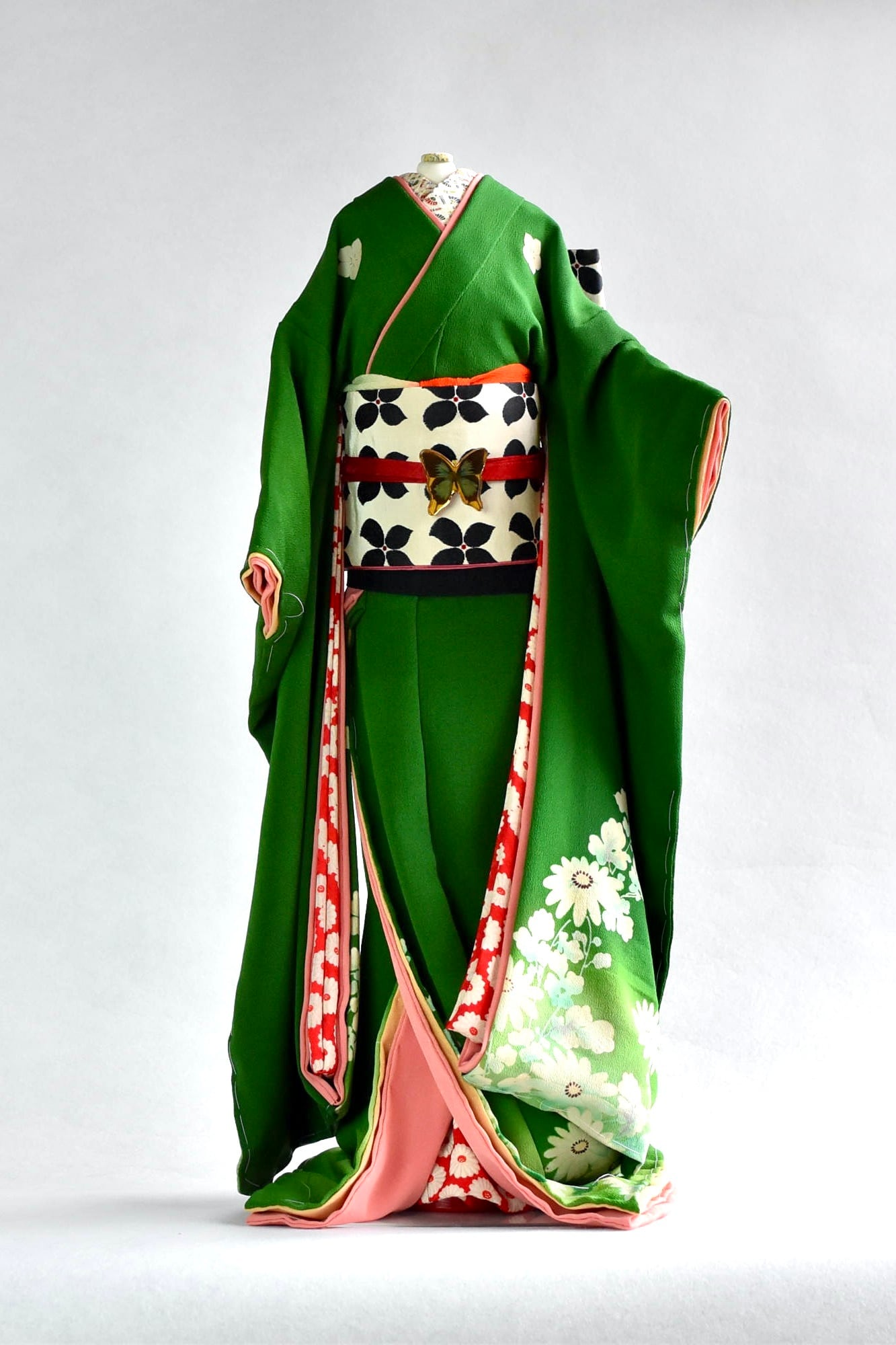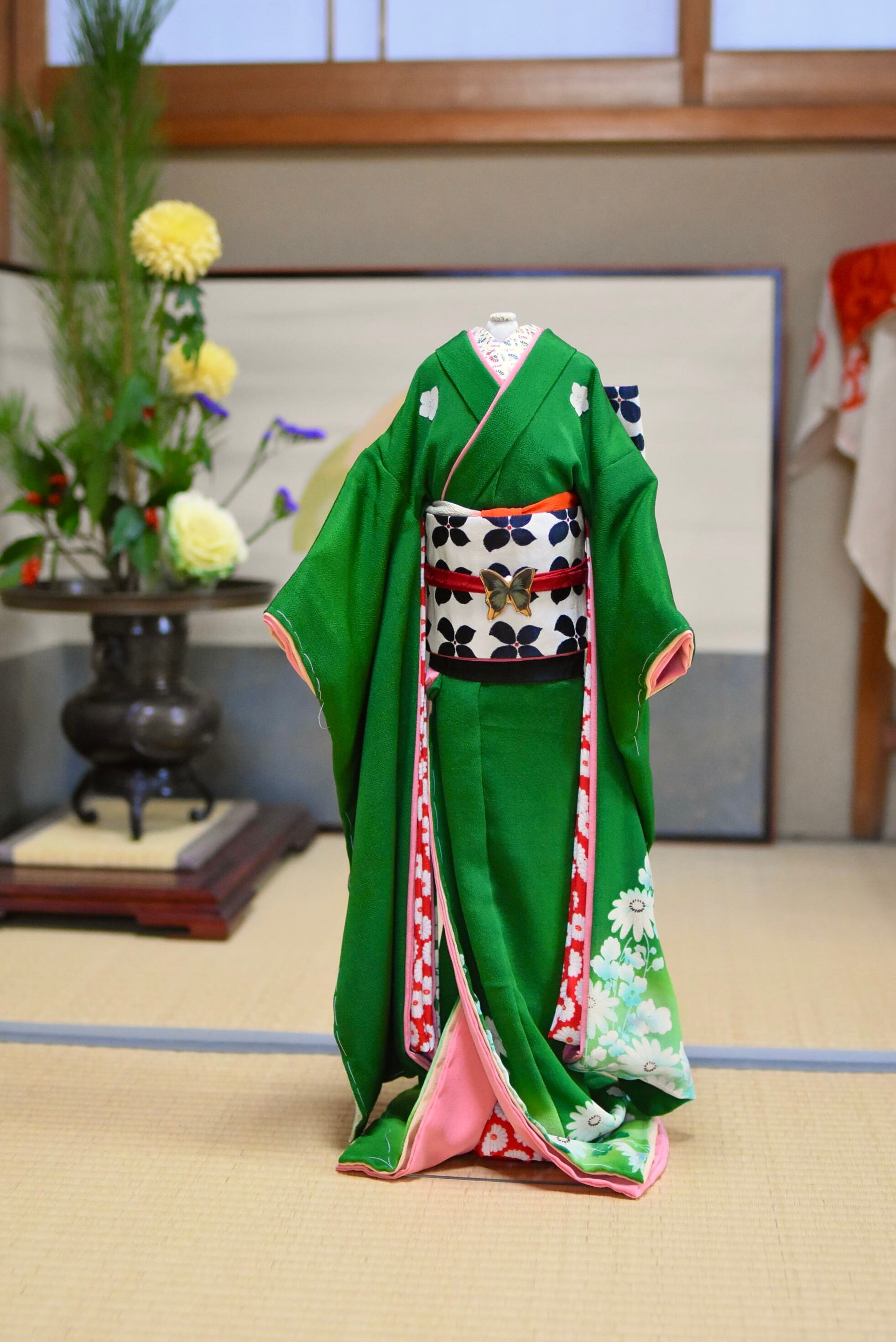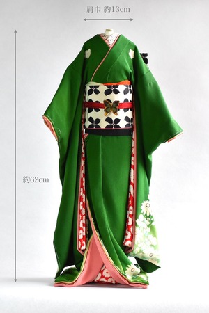 上品で色鮮やかなgreenが目を惹く五つ紋付の振袖こべべ作品。高さ60cm『晴れこべべ』シリーズ。- hare cobebe -