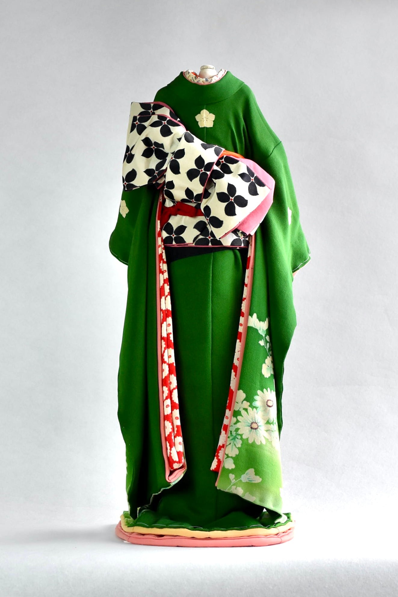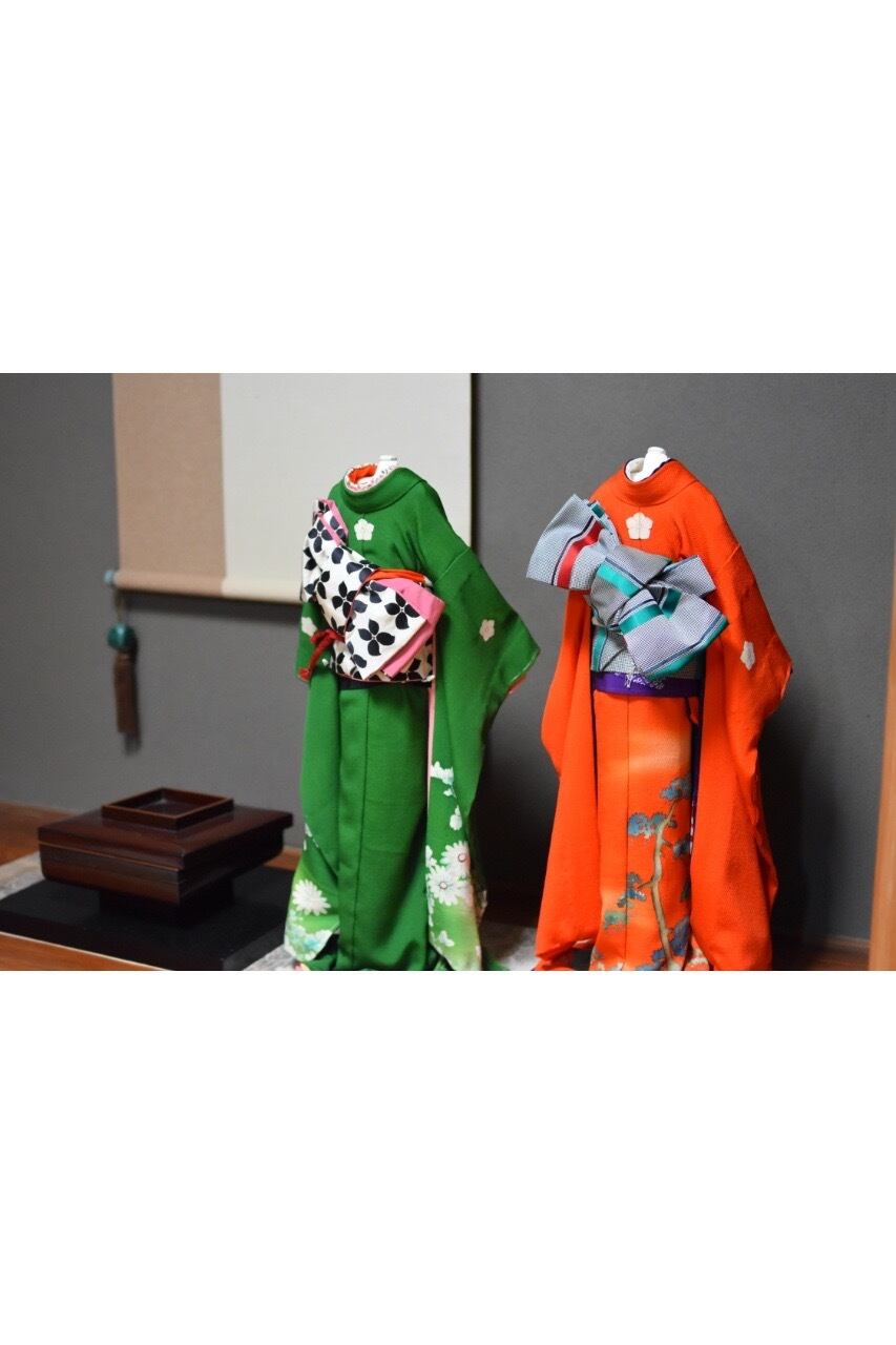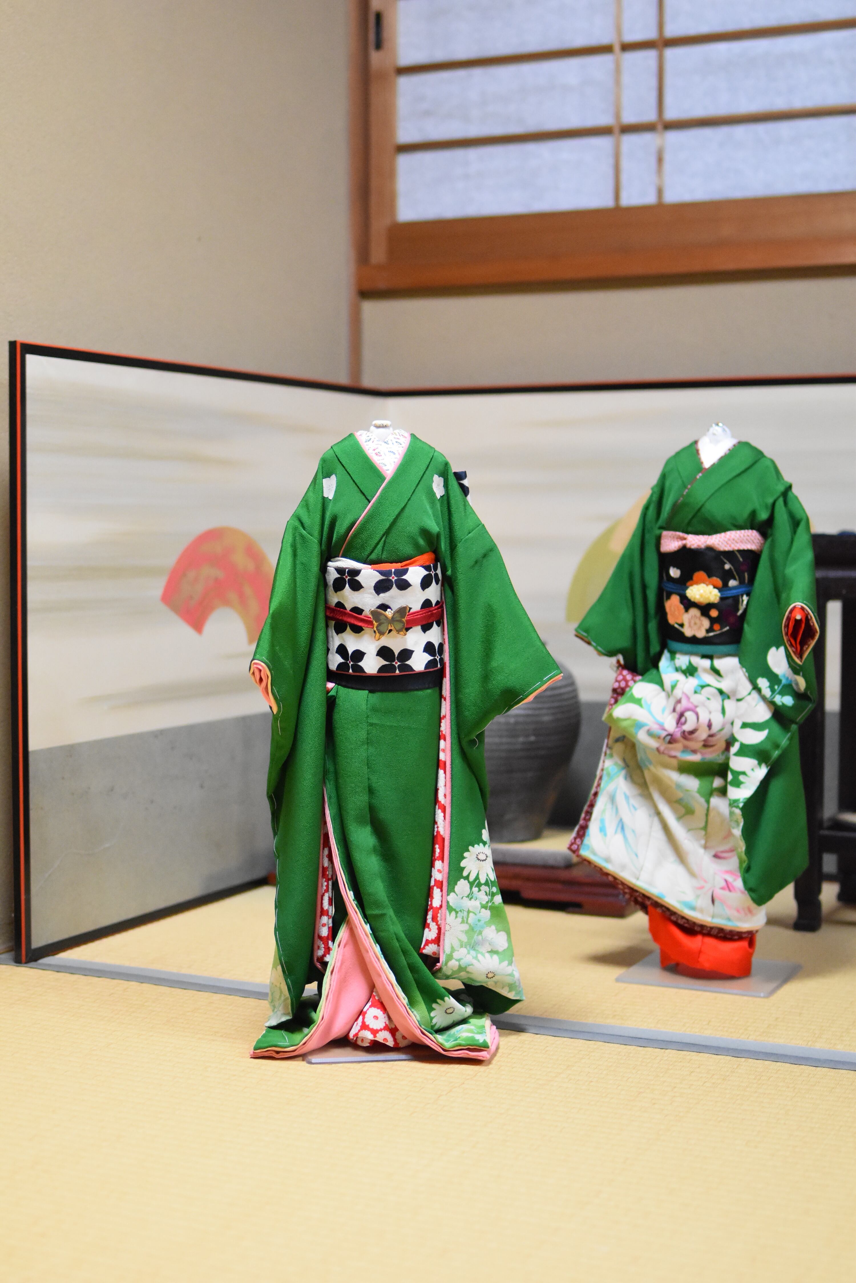 こべべは小さくても本格的。正絹の古布を使用し、熟練の和裁士により着物・襦袢・帯・帯じめなど、こべべサイズの小さな着物一式すべてを手縫いで製作し、こべべ専用のトルソーに着付けています。