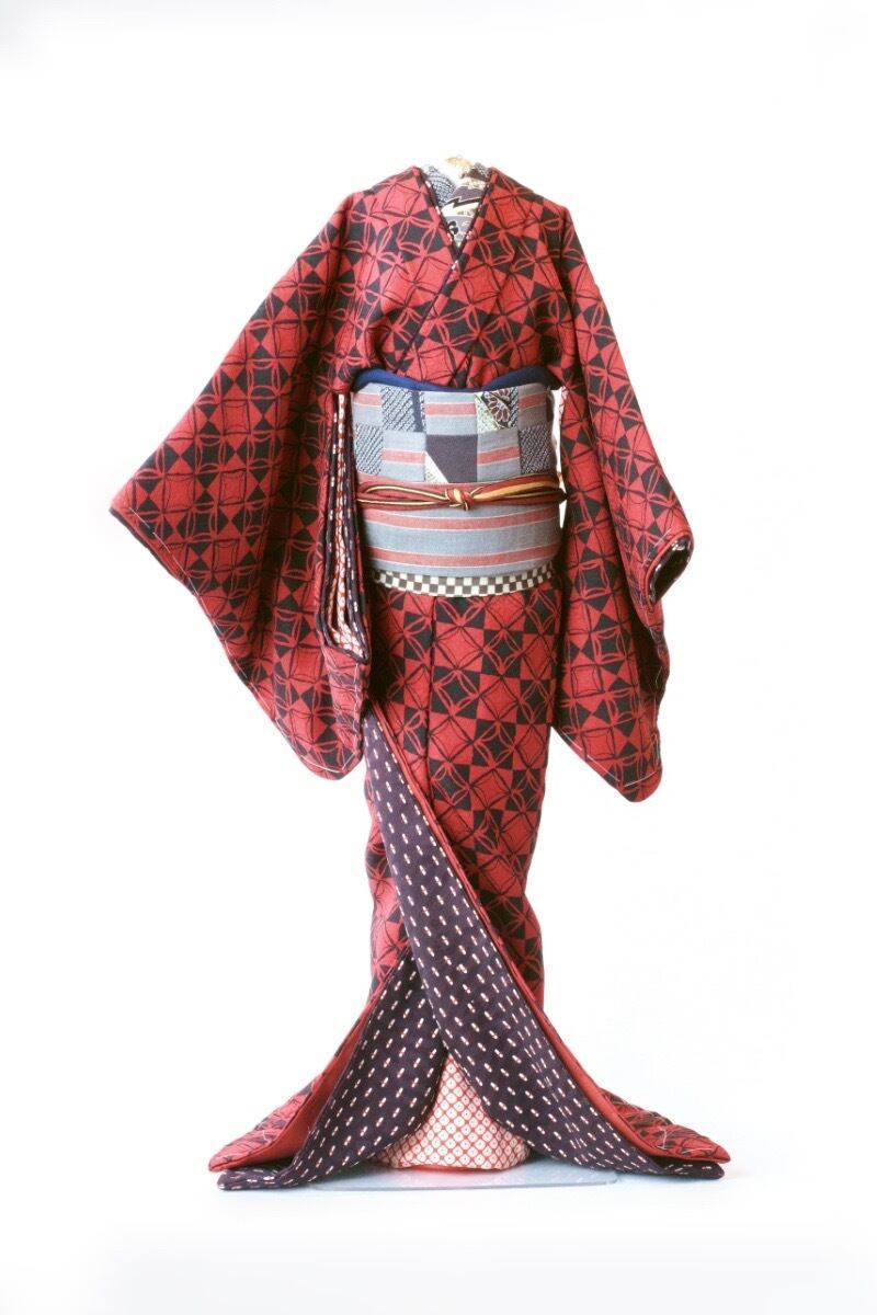 着物は、比翼仕立て(ひよくじたて)という、着物を二枚重ねて着ているように見せる技法で仕立てており、裾の袘(ふき)部分には綿を入れ重厚感ある佇まいに。