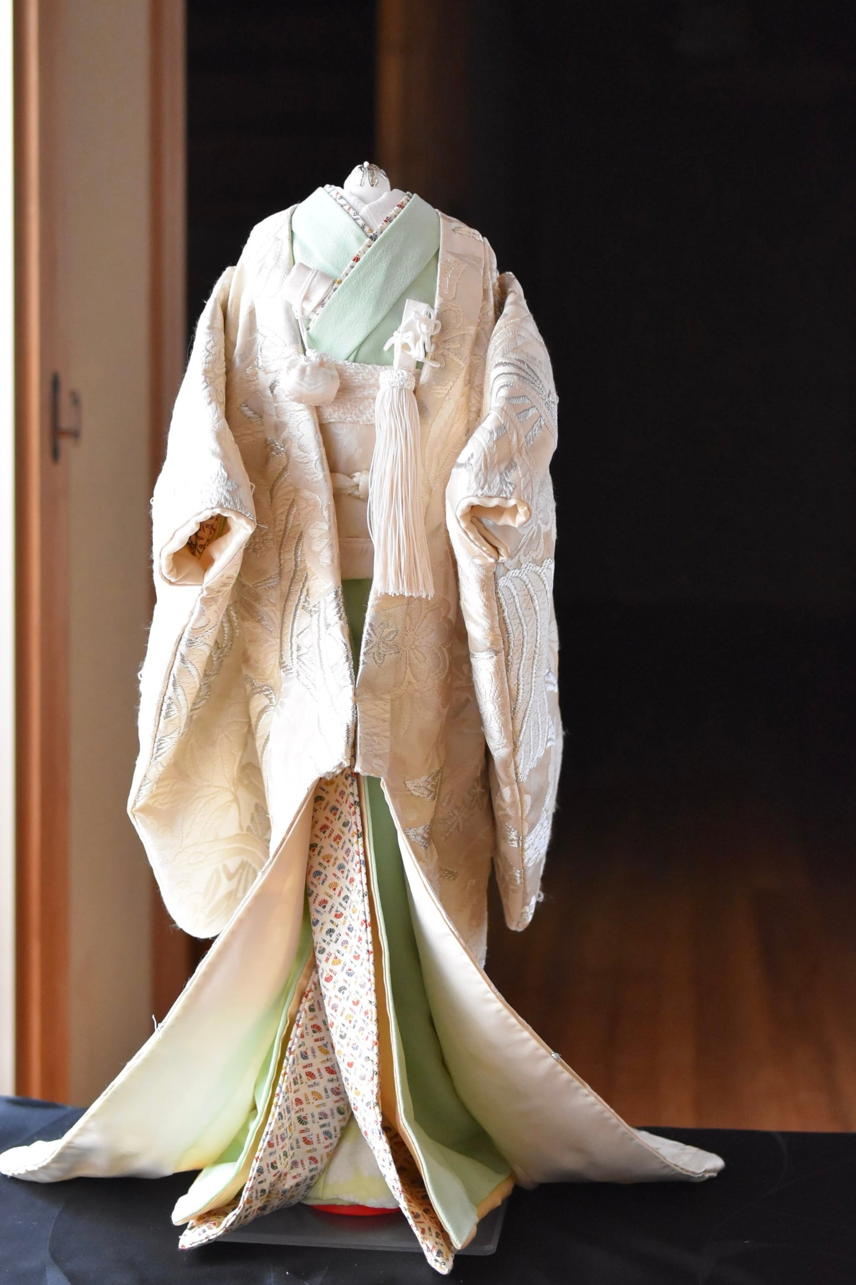 こべべは小さくても本格的。正絹の古布を使用し、熟練の和裁士により着物・襦袢・帯・帯じめなど、こべべサイズの小さな着物一式すべてを手縫いで製作し、こべべ専用のトルソーに着付けています。